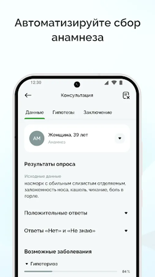 3. Taking an anamnesis with the help of a preliminary survey - before the start of the consultation, you will already have primary information about the patient and hints about possible diseases according to clinical recommendations;