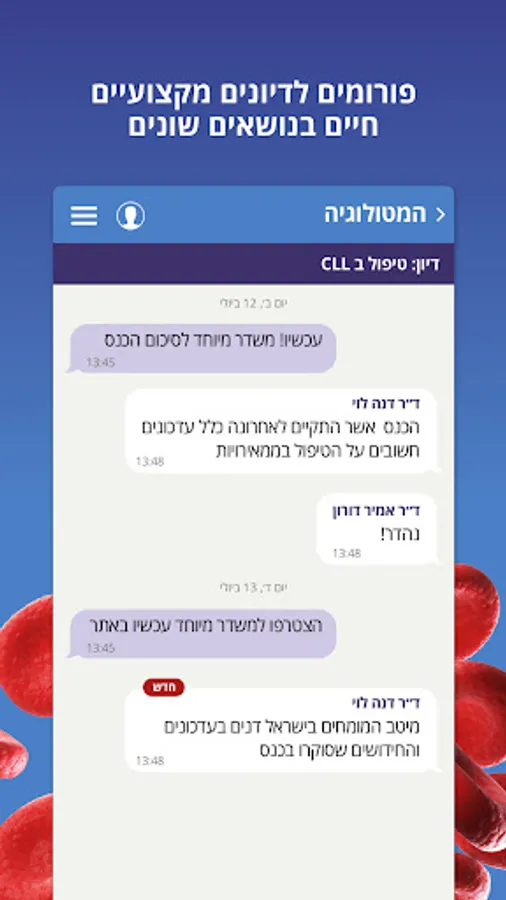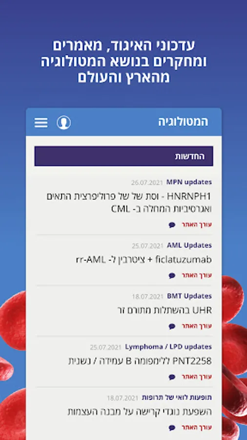 Association updates, articles and research on hematology from Israel and the world, conference updates and announcements from all departments, forums for live professional discussions on various topics