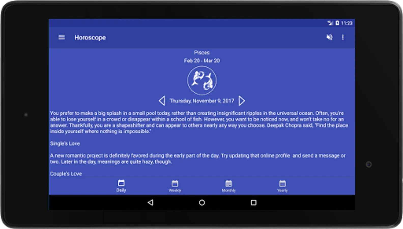 - Daily horoscope (Yesterday, Today, Tomorrow)