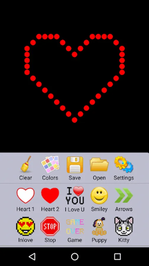 Other settings are on the Menu --> Settings, some of the settings that you can change are: LED size, color, background, brightness, blink, blink mode. There are several predefined drawings such as hearts, I Love You message, smiley, puppy, kitty etc. All these drawings you can save and share as image or animated image.
