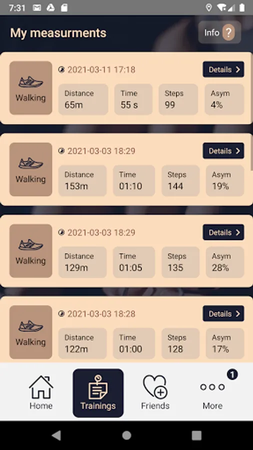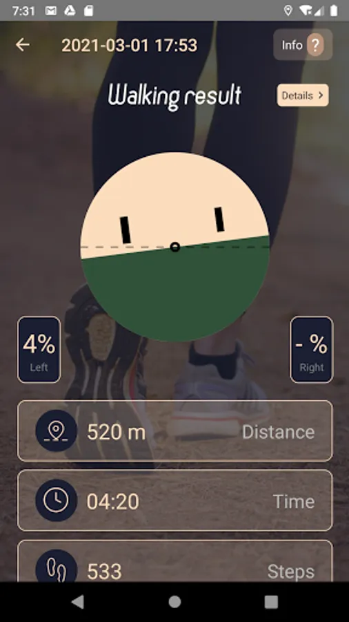 After a walk, e.g. the time distributed on the left and right feet (step time, ground contact time and time for feet in the air), step length, distance, vertical force, step frequency, number of steps, etc. are measured. This is displayed both in the list and in graphs. Asymmetry is calculated as a sum of deviation from symmetry for a number of measures.