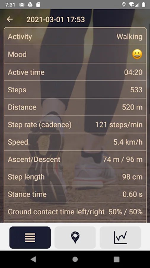 Mystep info is a sophisticated app used on the mobile phone, to analyze your step and other motion measurements, when walking and running. Download the app, register an account, start the app and place the mobile phone in a waist belt, centered on the back, when running or walking.