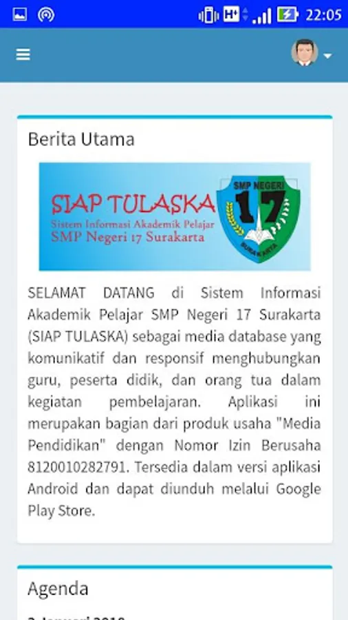 The Student Academic Information System of SMP Negeri 17 Surakarta (SIAP TULASKA) as a communicative and responsive media database connects teachers, students, and parents in learning activities. This application is part of the "Media Education" business product with a Business License Number 8120010282791. Available in an Android application version and can be downloaded through the Google Play Store.