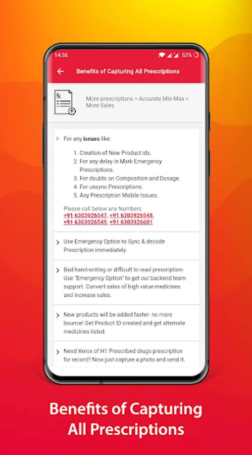 This prescription app is primarily used to capture the prescription images. Customers walk in to our stores along with prescription, this app will help the user to capture images of the prescription and send it back to the backend team. There is also an emergency prescription feature available in the app where the user can capture an image of the prescription, and while sending it to the backend team, mark it as an emergency prescription. The back end team will receive it as an emergency alert and decode it and send it back to the store team. Apart from the prescription capturing, the app can also be used to complete the E-KYC of our customers and as a picking app in the stores.