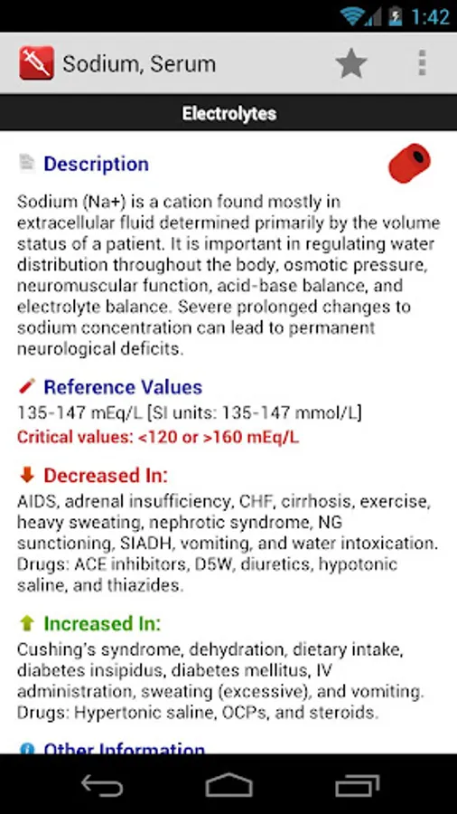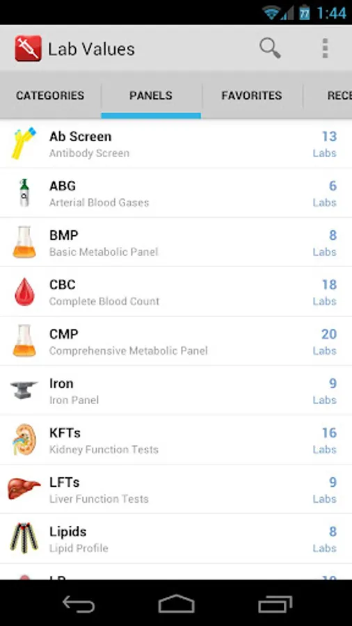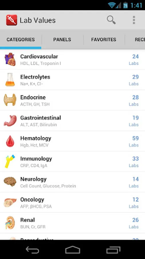 Designed for medical staff in training and in practice, each lab contains important clinical information, critical lab values, differential diagnoses, tube colors, useful websites, and easy access to related lab values needed for work in a hospital or primary practice care setting. You also have the ability to edit the lab values and tube colors to match your current institution as well as write notes about a lab to remember later. All of this in a polished, easy to use interface that quickly lets you search for labs you might have not encountered (by both common name and abbreviations), save favorite labs for easy access, and view the last 20 labs to quickly get back to what you were looking at before.