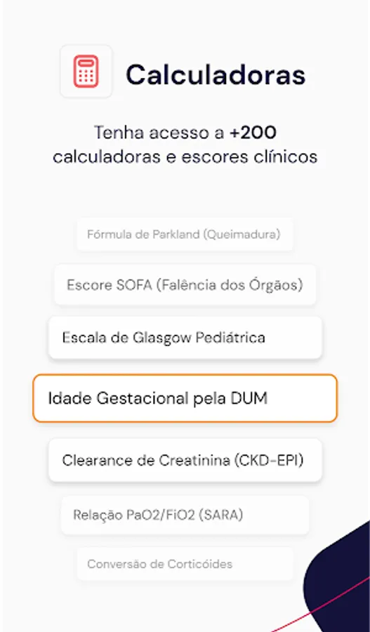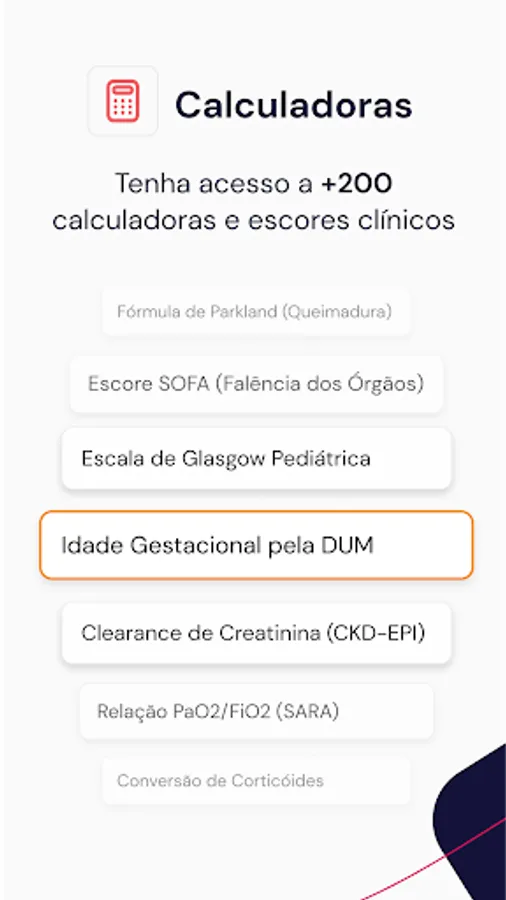* Medical Calculators and Scores: access to the most important medical calculators and scores for clinical decision making, such as: gestational calculator (e.g. Gestational Age calculator by LMP); ventilation calculators (e.g.: Arterial Blood Gas Interpreter); kidney function calculator (e.g.: Creatinine Clearance - Cockroft-Gault); scales (e.g.: RASS Scale and Ramsay Scale); pediatric scores (e.g.: Pediatric Glasgow Scale); clinical scores (e.g.: Risk of Mortality in HF); infusion pump (e.g.: Conversion of Drops/min to mL/h) and various calculators, such as Mini Mental. Don't waste any more time racking your brain with calculations: there are more than 170 tools available!