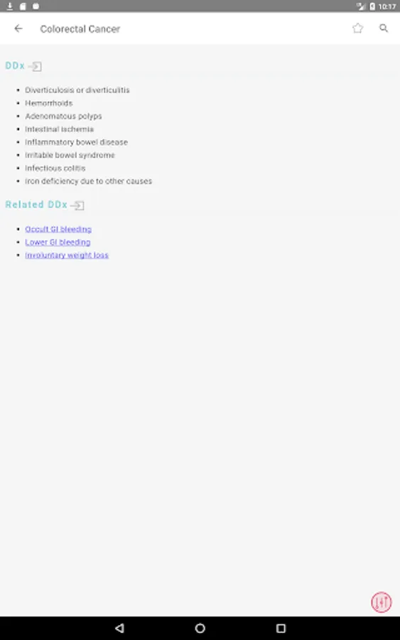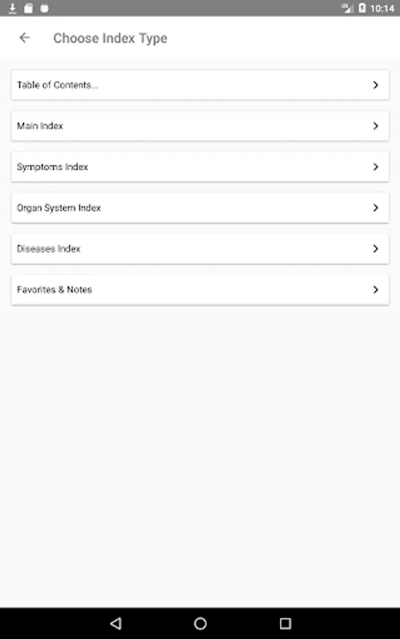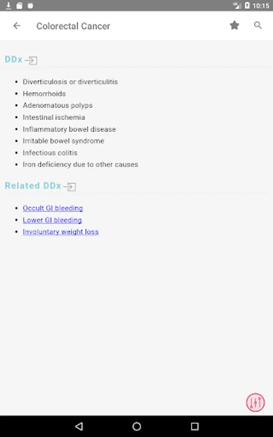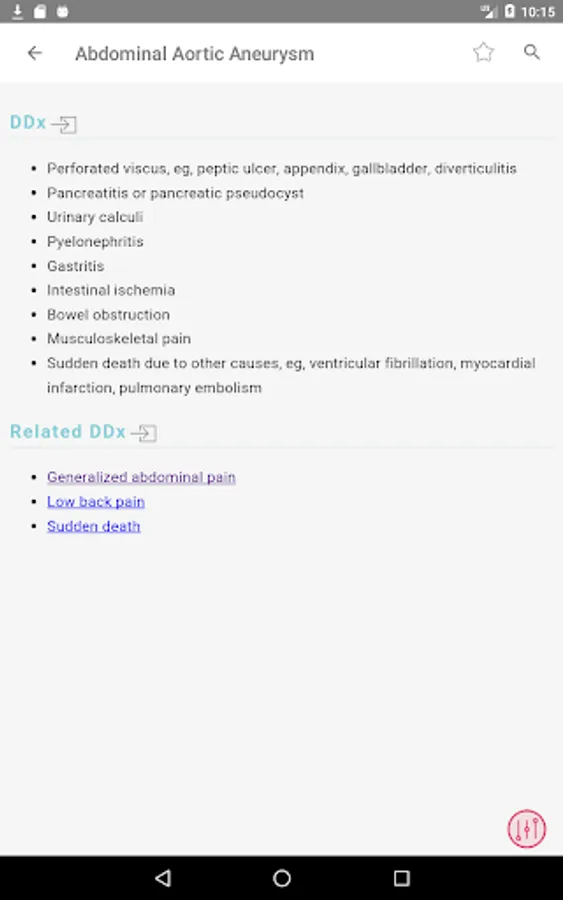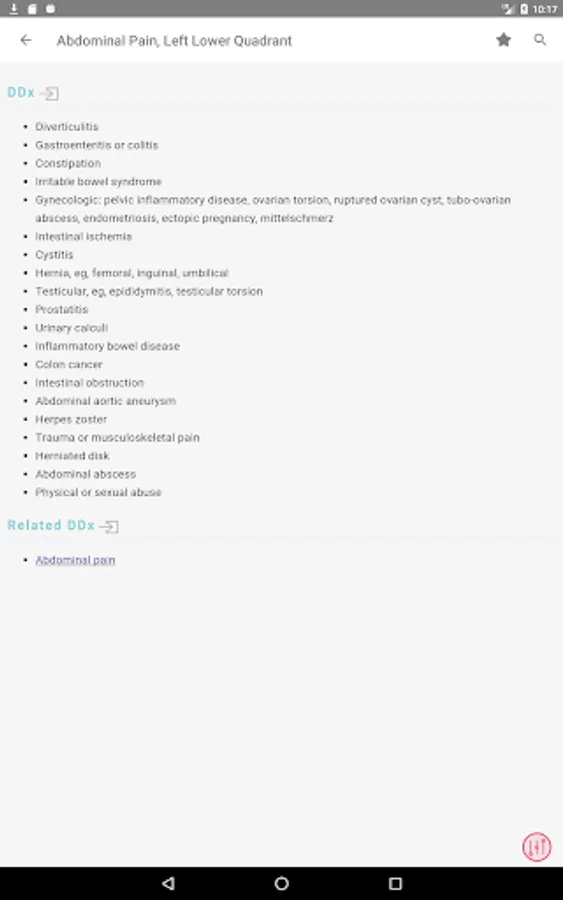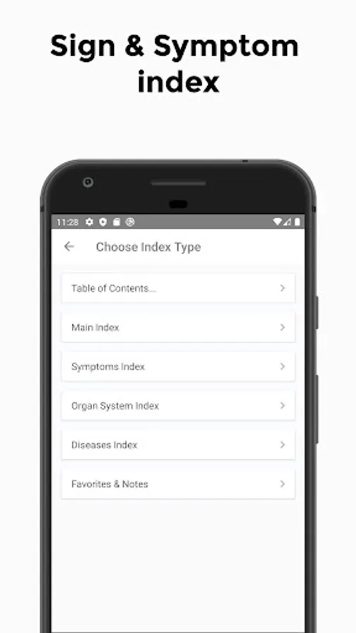 With MobileDDx™ you can choose to explore topics by organ system, symptoms or diseases only, or search across all topics. For example, if you wish to review the causes of a patient's chief complaint, simply select the symptom or sign from the main index. If you have made a diagnosis and wonder what other disorders to consider, select your diagnosis from the list to see its differential diagnoses.