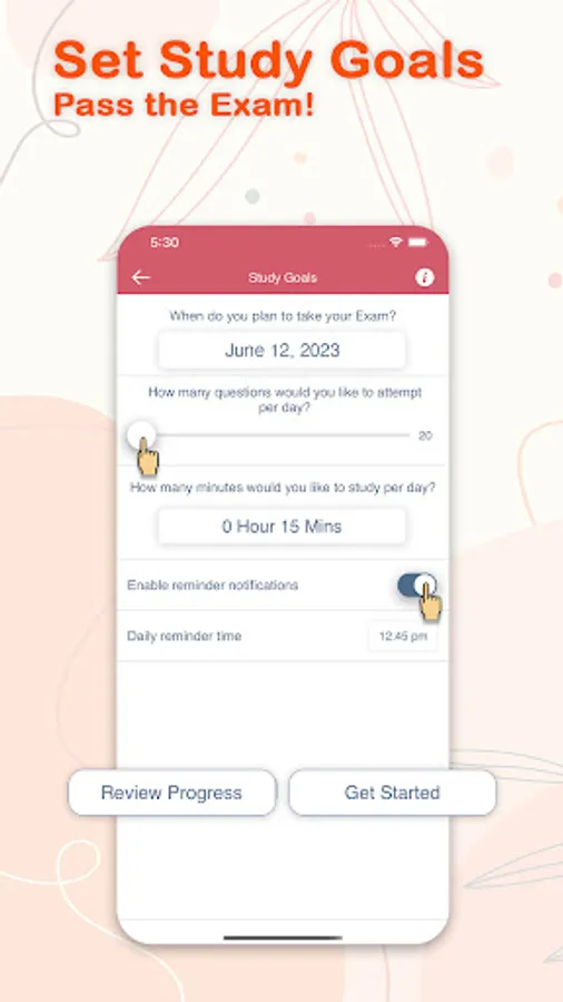 * Study Goals (Recommends quantity of questions to complete daily based on goal/test date)
