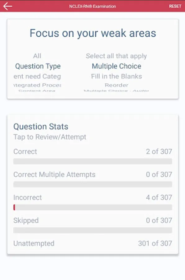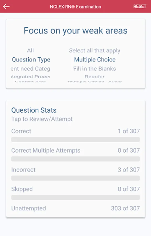 - The app tracks metrics on attempted questions so you can focus on your "Knowledge" gaps
