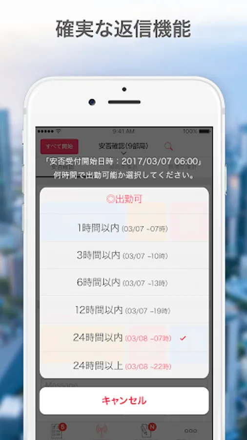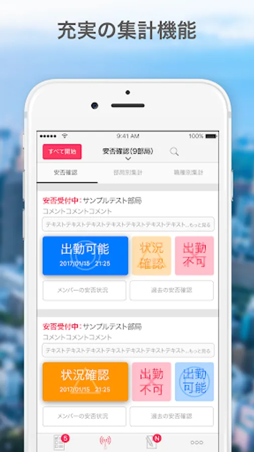 A safety confirmation system that focuses on simple operations. When the safety confirmation is announced, the confirmation reply is completed at the push of a button. In accordance with the BCP measures manual of the Ministry of Health, Labor and Welfare, if it is safe (can go to work), it is possible to check at once how many hours it is possible to go to work, so it is possible to grasp the number of people that can be convened in case of emergency response.
