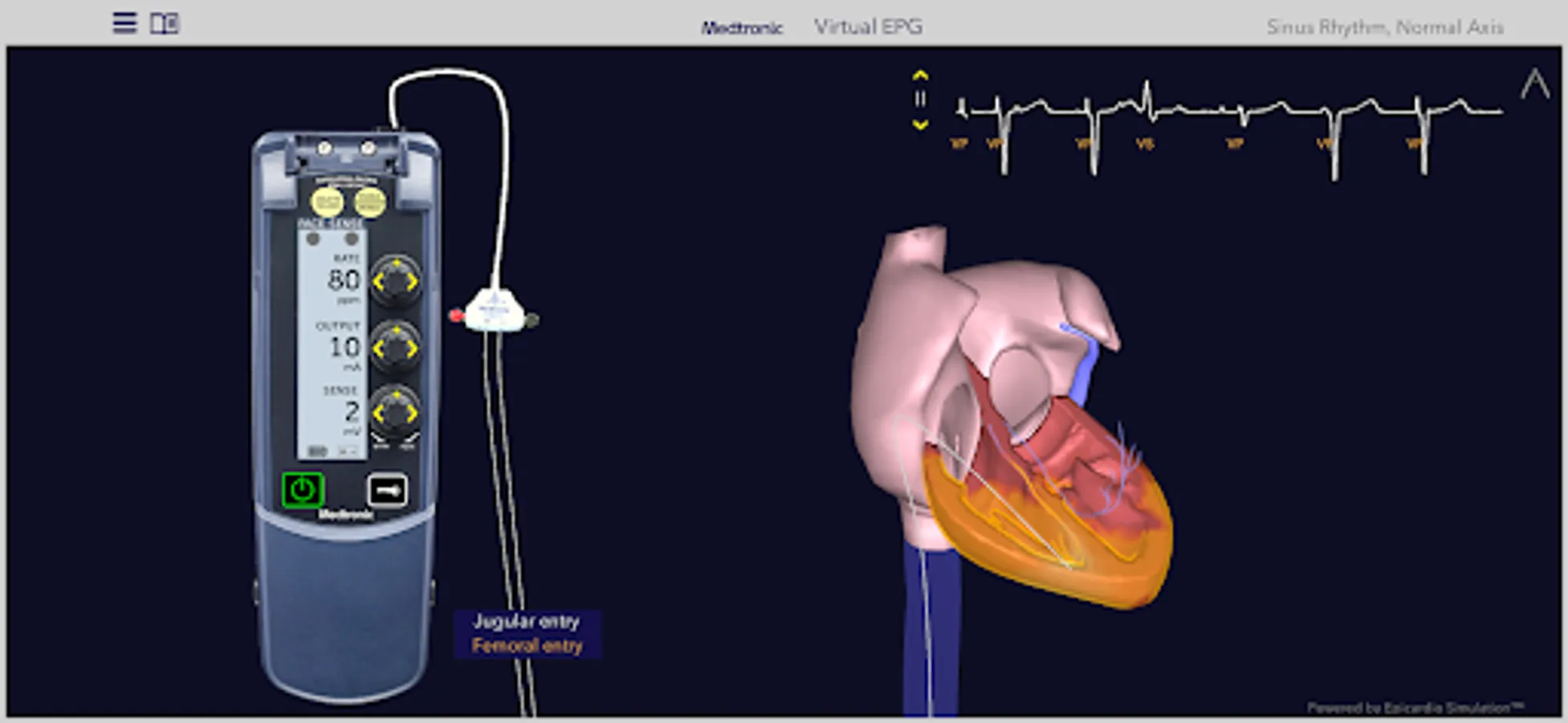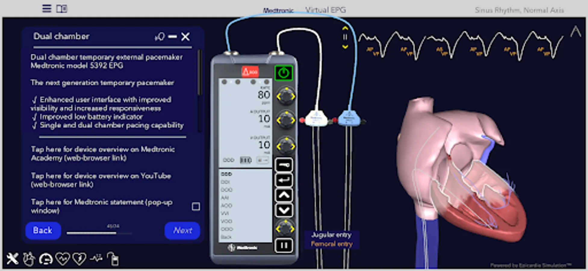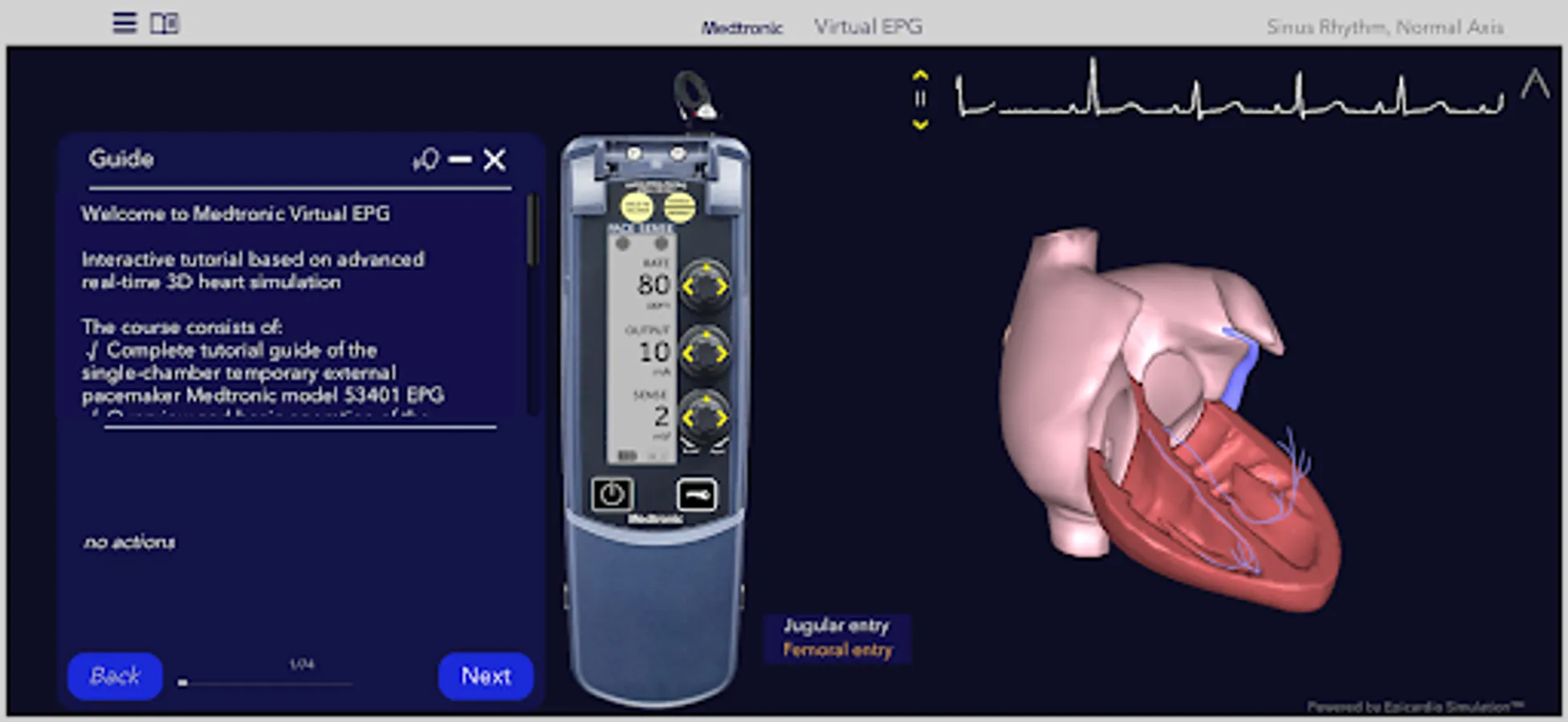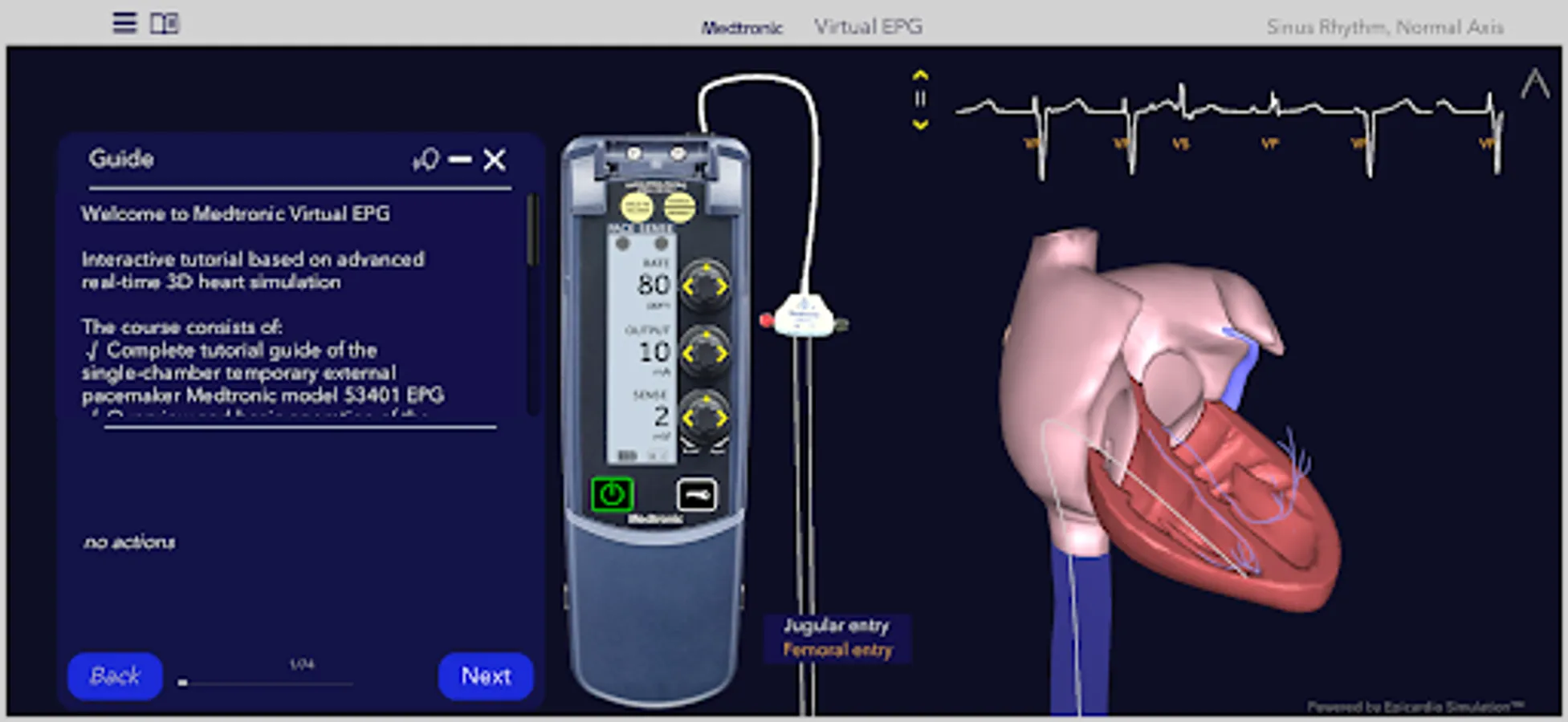 The course consists of interactive tutorials based on real-time 3D heart simulation, complete guide of the single-chamber temporary external pacemaker Medtronic model 53401 EPG and overview and basic operation of the dual-chamber Medtronic model 5392 EPG.