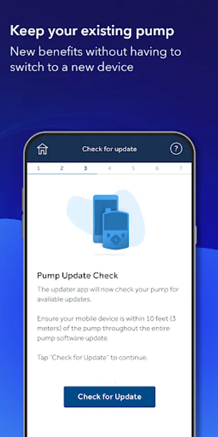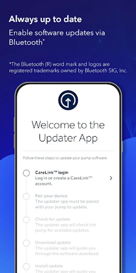 The Updater app connects with the MiniMed™ 700-series pumps via Bluetooth* communication. The software update process with Updater app puts you in control, giving you the freedom to update pump software remotely. And it does it all using the same pump you already have on hand.
