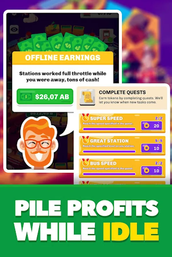 You will become a multi-billionaire and a tycoon of the idle world of bosses.You have so many things to take care of. You need to upgrade your stations, trains and complete quests.Every new station you build by investing another country will increase the number of passengers you carry and help you through your journey to be a tycoon. Keep upgrading your trains to be able to move to a completely new world. Earn tokens by completing tasks in your railway company and make permanent upgrade by using them.