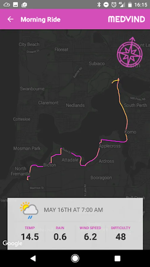 That information is then used to draw the ride route onto a google map. The route colour is changed based on weather you are headed into the wind or away from the wind which makes it really easy to quickly visualise how hard the ride will be and what sections of the ride will be a challenge.