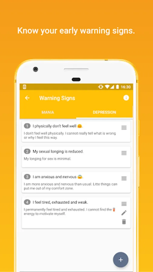 • Your personal early warning signs for hypomania, mania or depression are automatically displayed when you report an unusually depressed or elevated mood to UP!