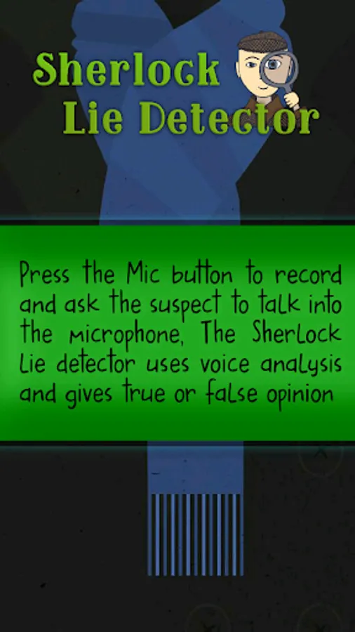 Sherlock Lie Detector analyzes the recorded voice and detects whether the suspect is a liar or not. It can be used for fun with friends and relatives. This Lie Detector analyzes and detects using voice analysis technique. You can find whether your friend is lying by simply asking questions to them and touch the microphone button. The Sherlock Lie Detector starts analyzing the person's speech and determines whether its a lie or truth in this lie detector test.