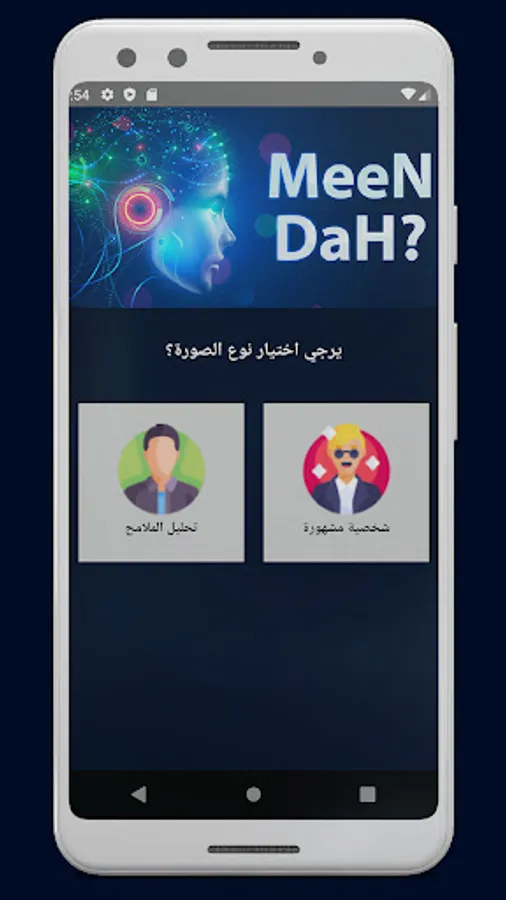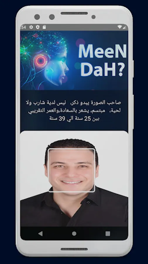 The Minda application analyzes personal photos and displays information about them, such as the approximate age and facial characteristics. It also identifies famous personalities and displays information about them and a link to more details about the character. The application analyzes images using artificial intelligence techniques through the Image Recognition service from Amazon Web service.