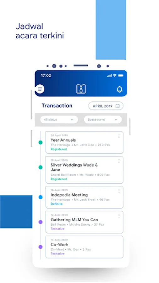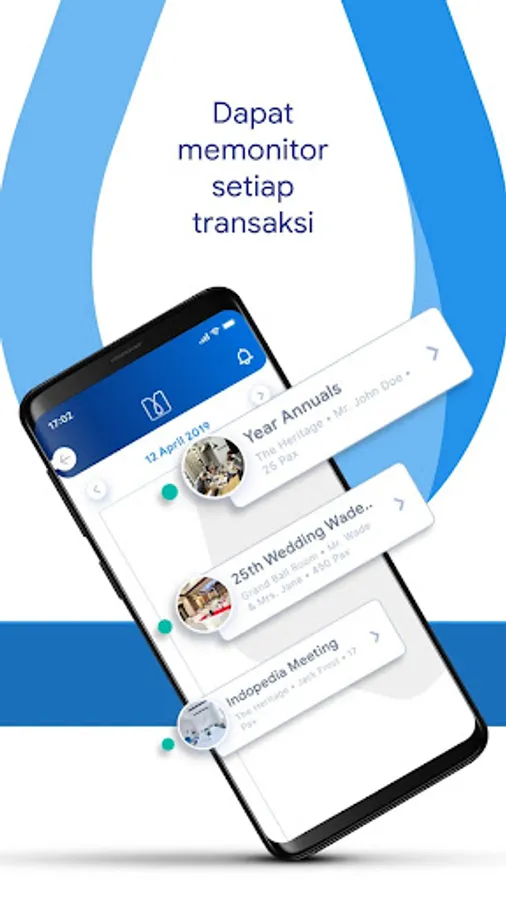 Mobile app with functions as Banquet Management System (BMS) to manage the events by sales venue. The advantages of this application, can see the availability of space in real time, transactions that are being processed and those who have succeeded and can book events directly when communicating with clients using a smartphone.