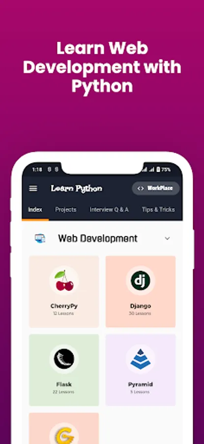 Python provides multiple frameworks for the web development. This app covers most commonly used python libraries which are used for web development. All the mentioned libraries in this Learn Python Application are the first choice in certain project-specific conditions/requirements. Also, while trying to select the libraries, the developers interest (based on their queries and community support) is considered.