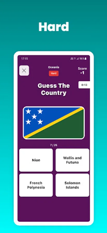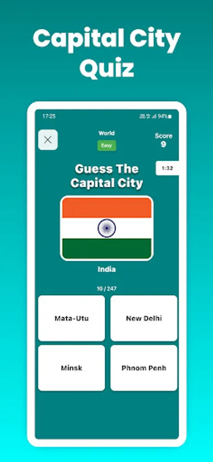 • Two game categories: Guess the Country Name and Guess the Capital City