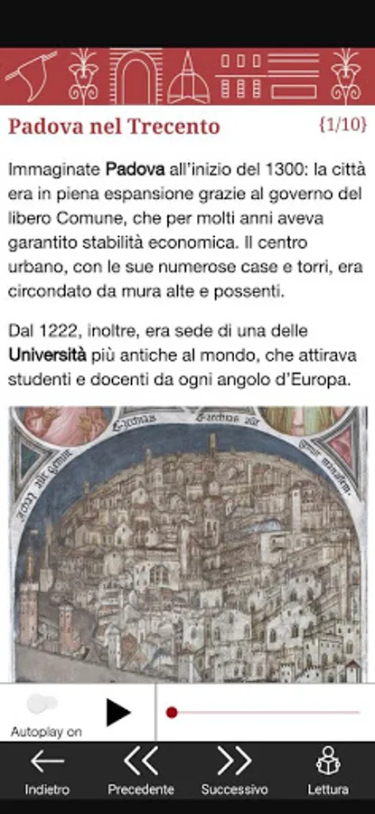 Each place is told through 10 contents: the texts are accompanied by reference images. You can choose to read and/or listen to the audio contents, also in Autoplay mode. If something is unclear to you, resort to the glossary!