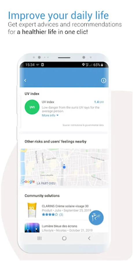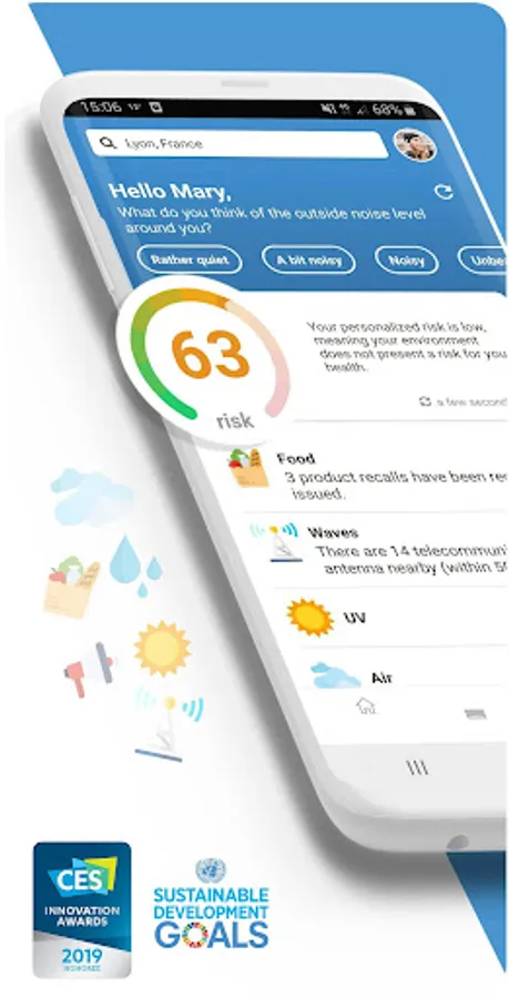 Map in real time the risks related to your environment, such as water pollution, allergens, pesticides, waves, harmful noise, endocrine disruptors as well as the health risks of your food products or in restaurants…