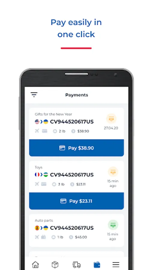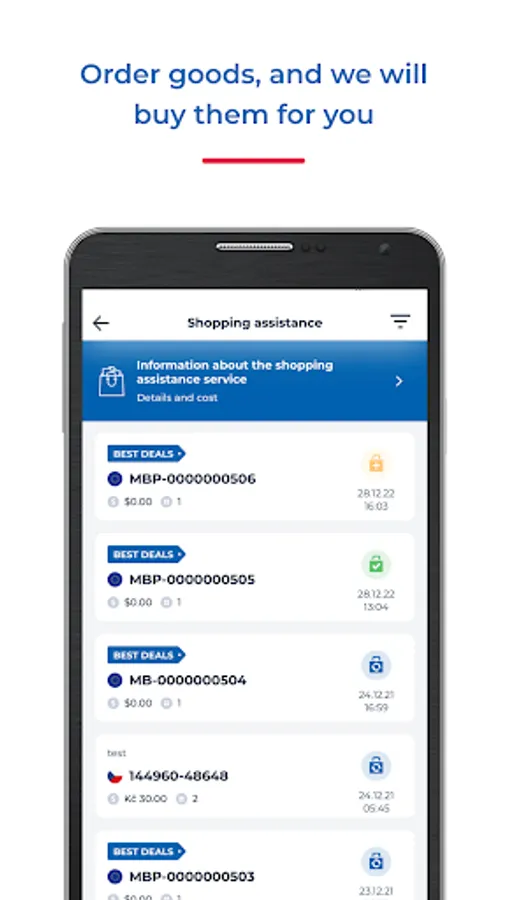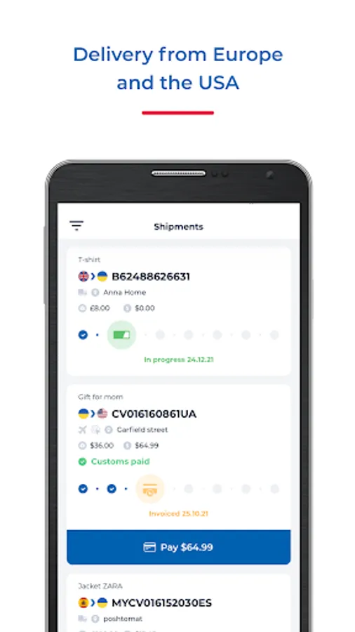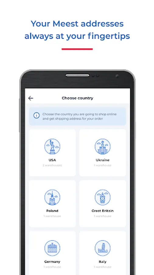 • Download the application, register and get a personal ID and addresses of myMeest Shopping warehouses in Europe and USA, to which online stores will deliver your orders.