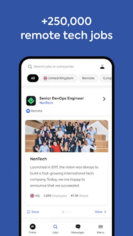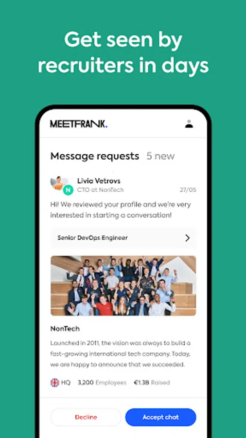 MeetFrank app helps you to be seen by 100s of recruiters and get remote job offers in days. Find out who wants to hire you – without applying to jobs.