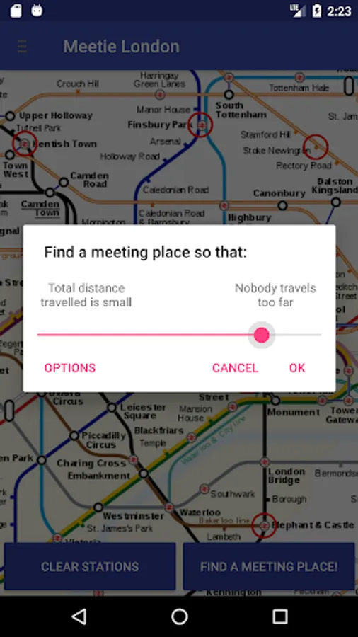 - Adjust Meetie London's algorithm to prioritise sharing the travelling time equally amongst your friends, or to ensure nobody travels an excessively long way