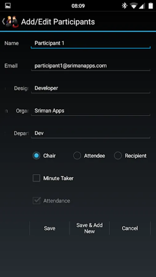 10) Integration with device contacts. No need to enter all participant information manually anymore. Can just select the desired contact that is already present on the device.