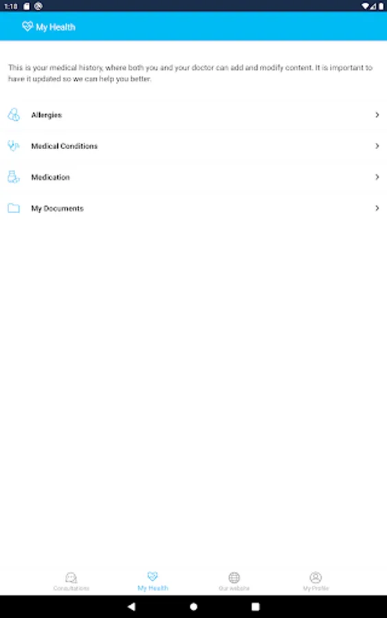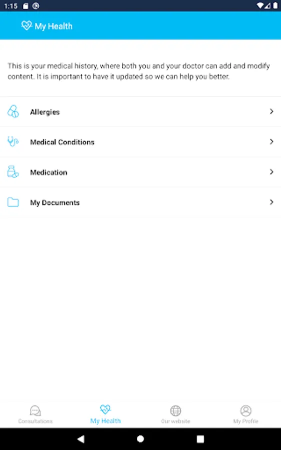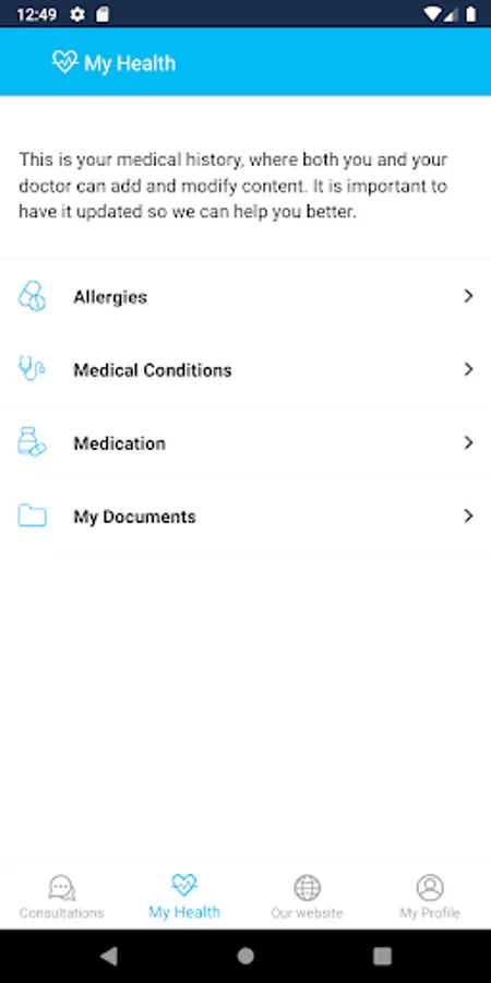 The application also allows you to maintain a simplified Electronic Medical Record in order to enjoy a more personalized service. Likewise, file sharing is implemented, ranging from medical reports & analytics to images & videos, hence enhancing the diagnosis procedure.