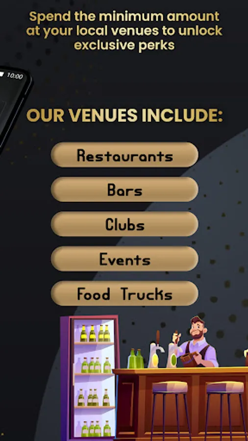 Get more for your money by using our app. Simply spend the minimum amount at your local venues to unlock exclusive perks such as free food, free drinks, and more. Our venues include restaurants, bars, clubs, events, and food trucks. Best of all, our app is 100% free to use.