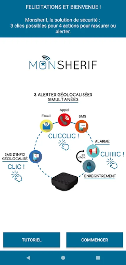 MONSHERIF© allows the geolocated and simultaneous sending of up to 5 contacts of an information sms or a triple alert - sms, email, phone call - to mobilize relief. It also allows you to trigger an audible alarm or a recording in order to restore evidence. The app can offer the possibility of depositing the recordings in a server secured by the blockchain for the restitution of tamper-proof evidence upon judicial requisition. The app also offers GPS access to nearby emergency points.