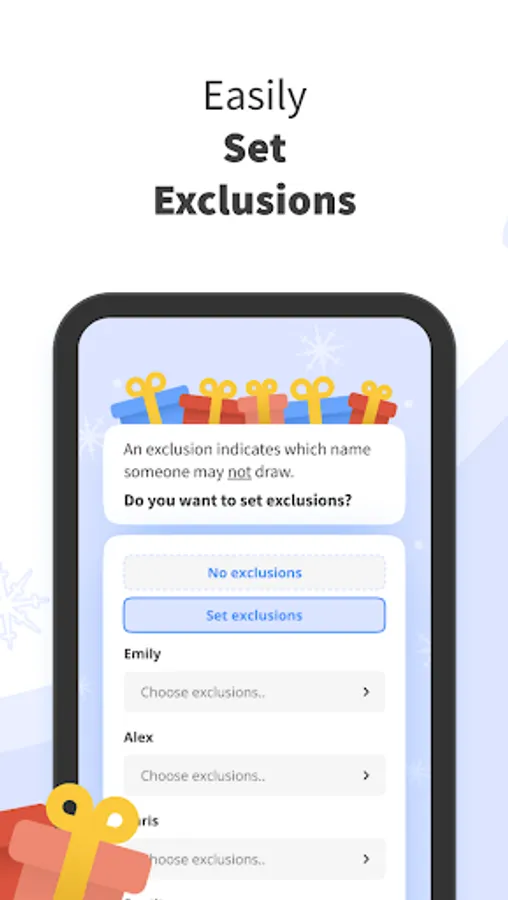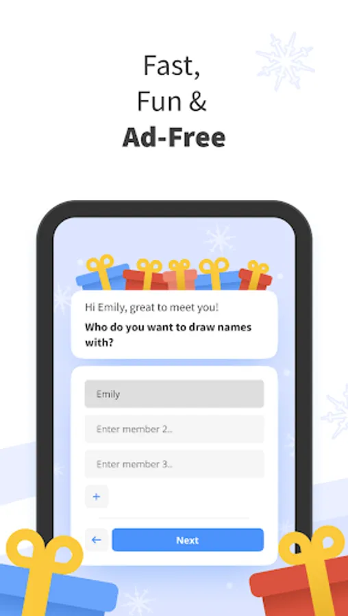 Start drawing names for your Secret Santa gift exchange and enjoy all the features straight away, no registration required, no ads, no in app-purchases.