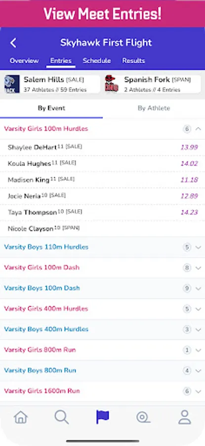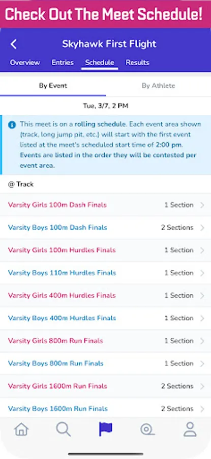 The meettrax app helps make meets better! When paired with the meettrax meet registration and management tools, coaches, athletes and fans will enjoy instant access to meet information and results!