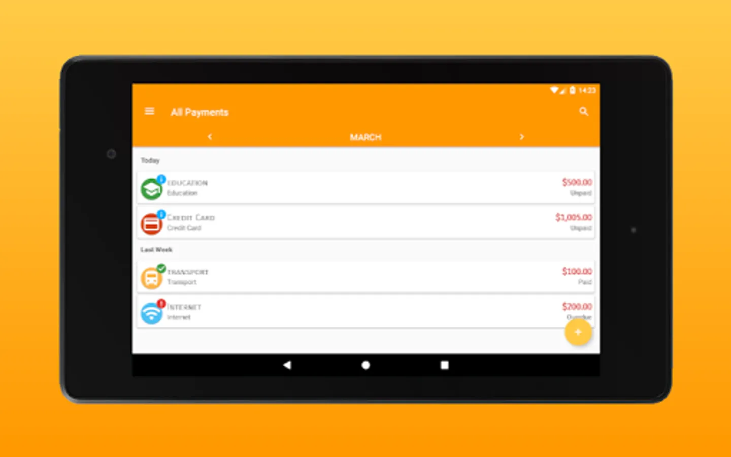 - This app also shows the total spending in the month, all your expenses, late payments and payments paid