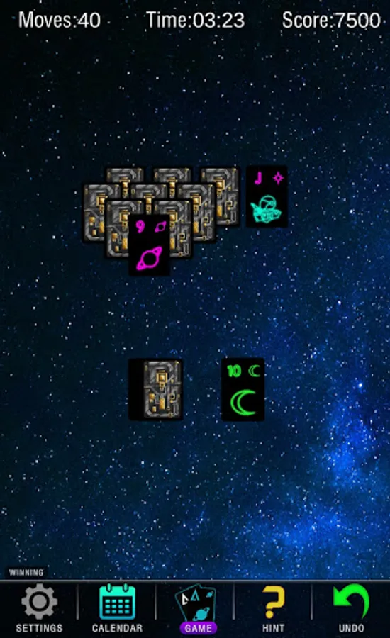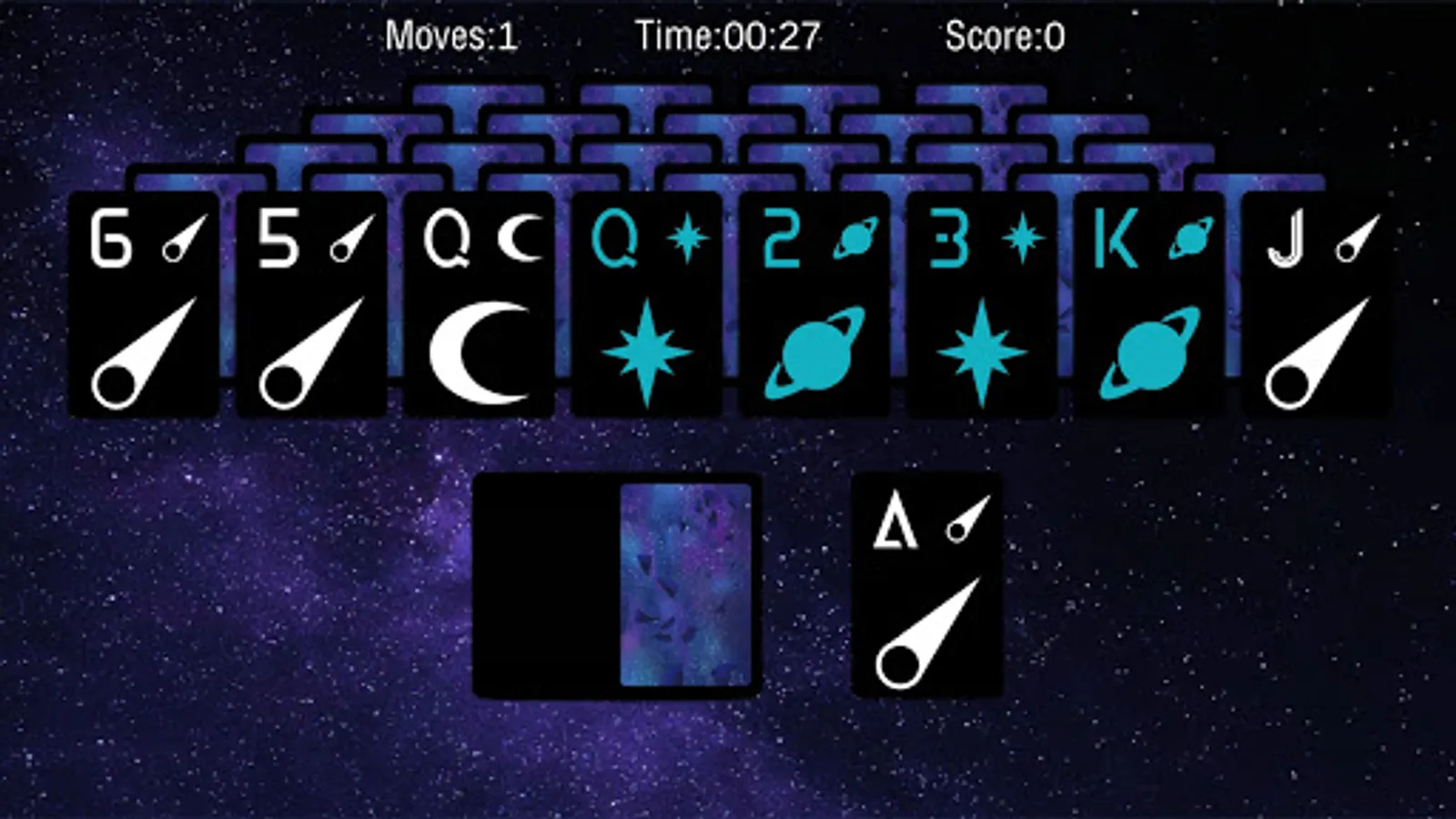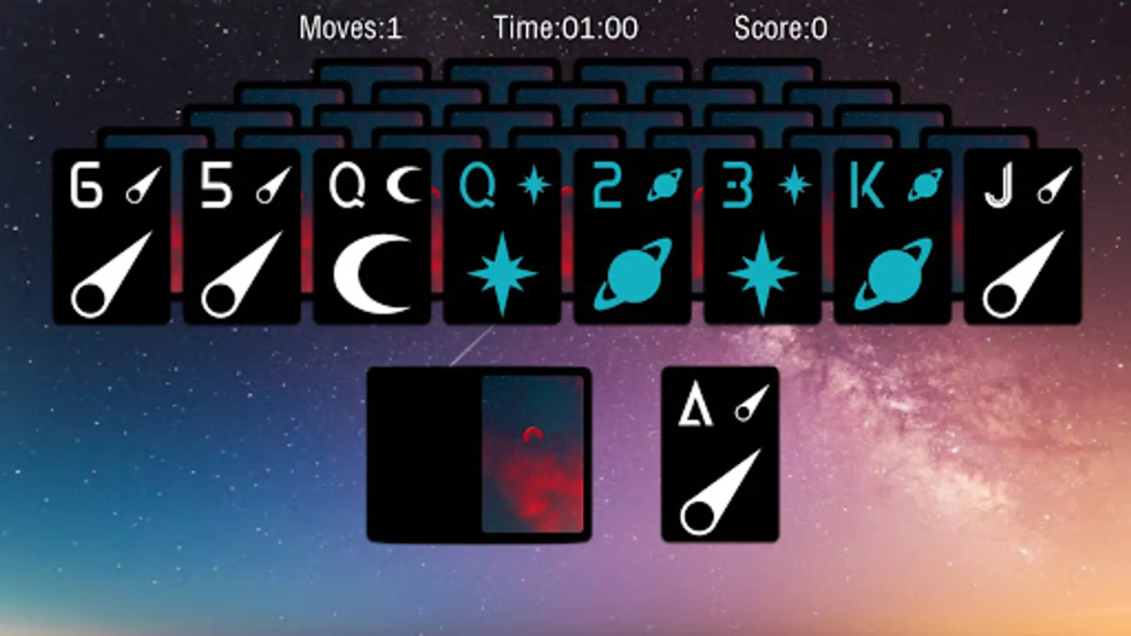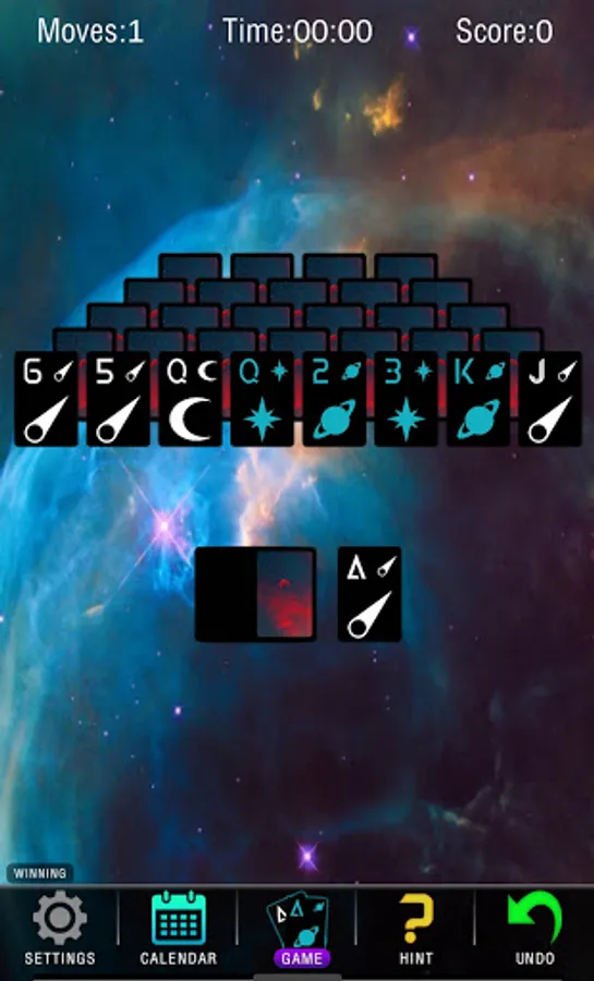 Ever stare up into space and wonder what it'd be like to be one with the cosmos? Wait no more friends. Let our game calm you after a long day at work. Sooth your worried mind. Let all your cares melt away with our casual space-themed take on tri-peaks solitaire.