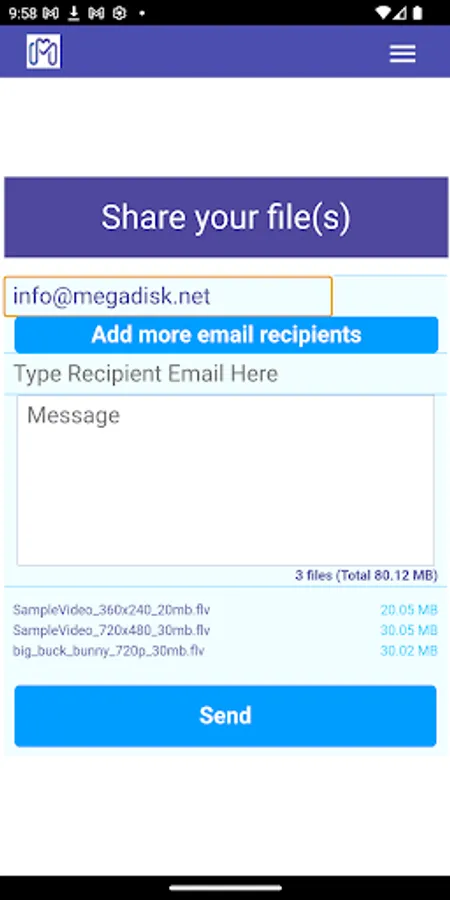 Megadisk offers a lightning-fast file transfer experience for Android users. Our app is designed to simplify the process of sharing files, allowing you to send photos, videos, documents, and more to anyone, anywhere, at any time. With Megadisk, you can bid farewell to file size restrictions and security concerns, as we provide a secure and efficient solution for your file transfer needs.
