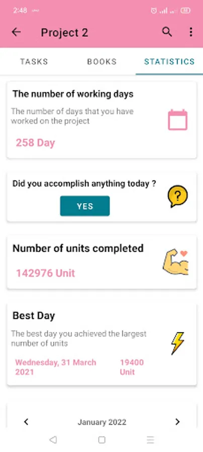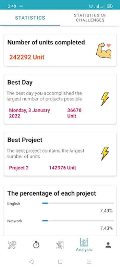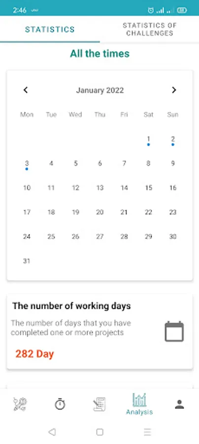 Detailed statistics for all projects, subjects or habits (also for each one separately) and it comes with a display of all days and months, the percentage of each project or subjects or habit , as well as the percentage of each month, the number of working days, the best day and the best project or subject or habit