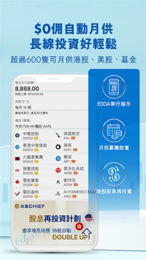 ● Auto Monthly Investment: Simply preset eDDA Standing Instruction anytime by just a few steps on Chief Trader to the Monthly Investment Plan for Stocks/ Funds and Dividend Reinvestment Plan.