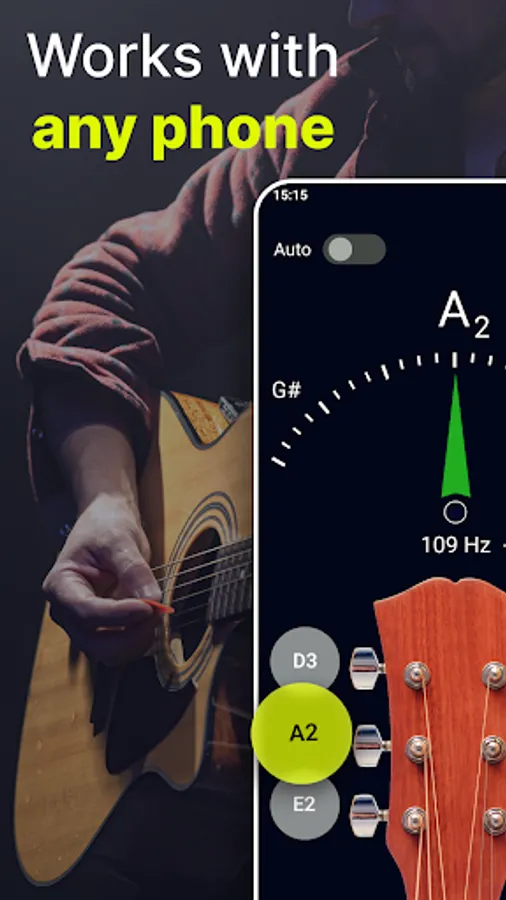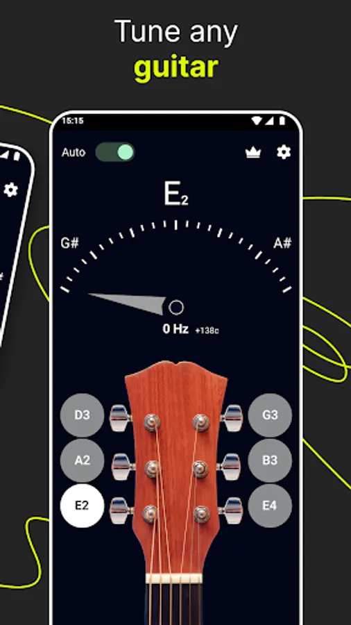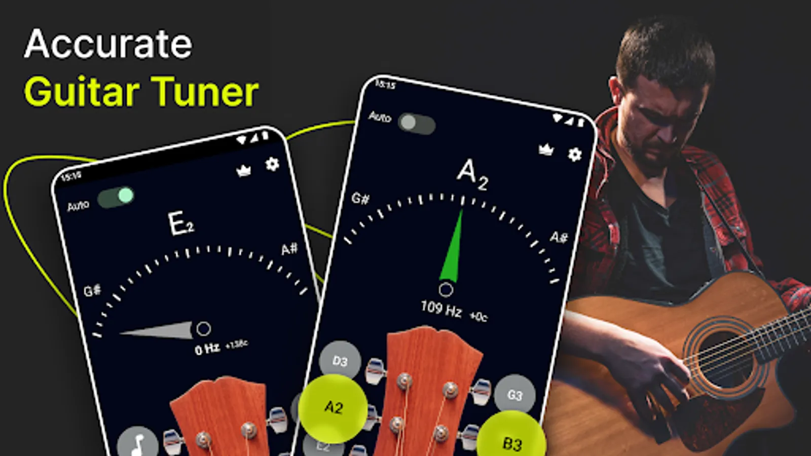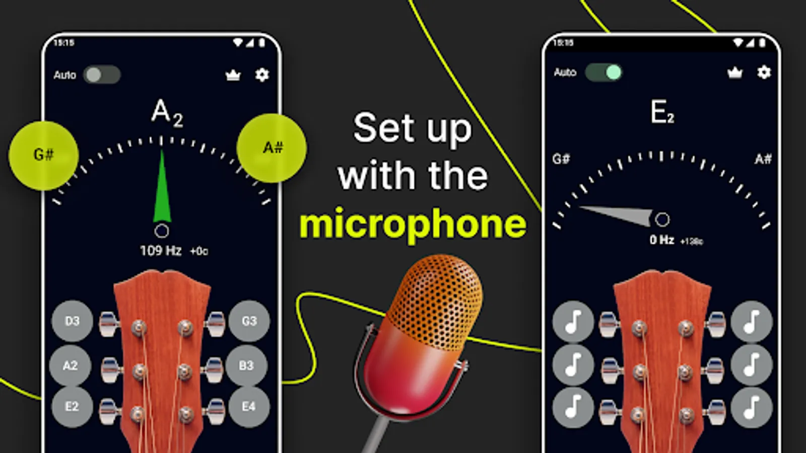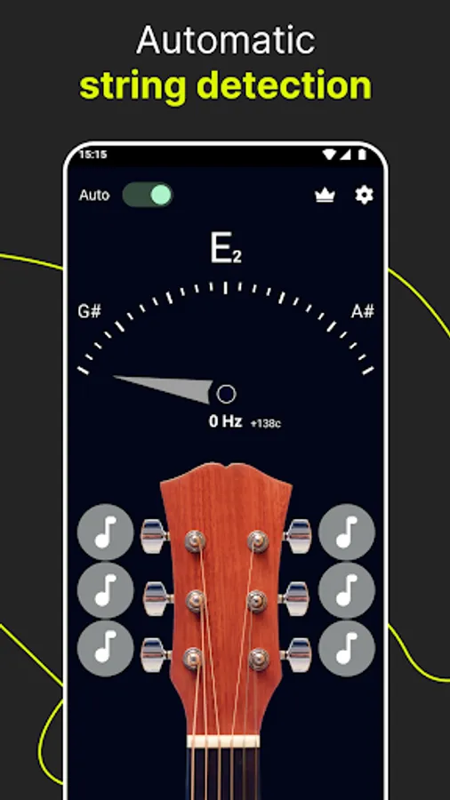 The guitar tuner app will accurately tune any guitar using the built-in microphone on your device. It's simple - dial and needle for tuning visually or use the tuning notes to tune by ear. This app will automatically detect which string you are tuning. Just play any string and start tuning!