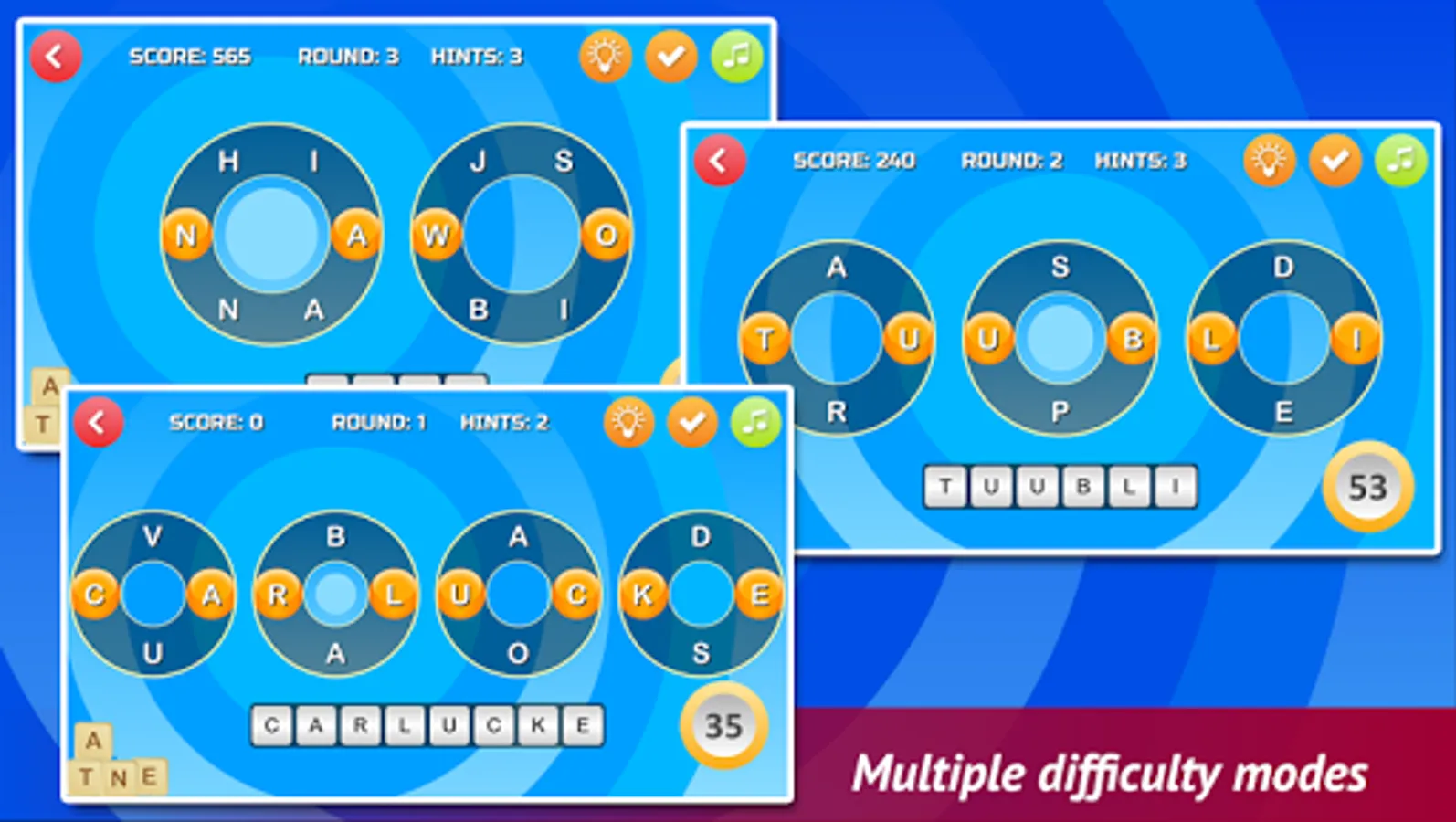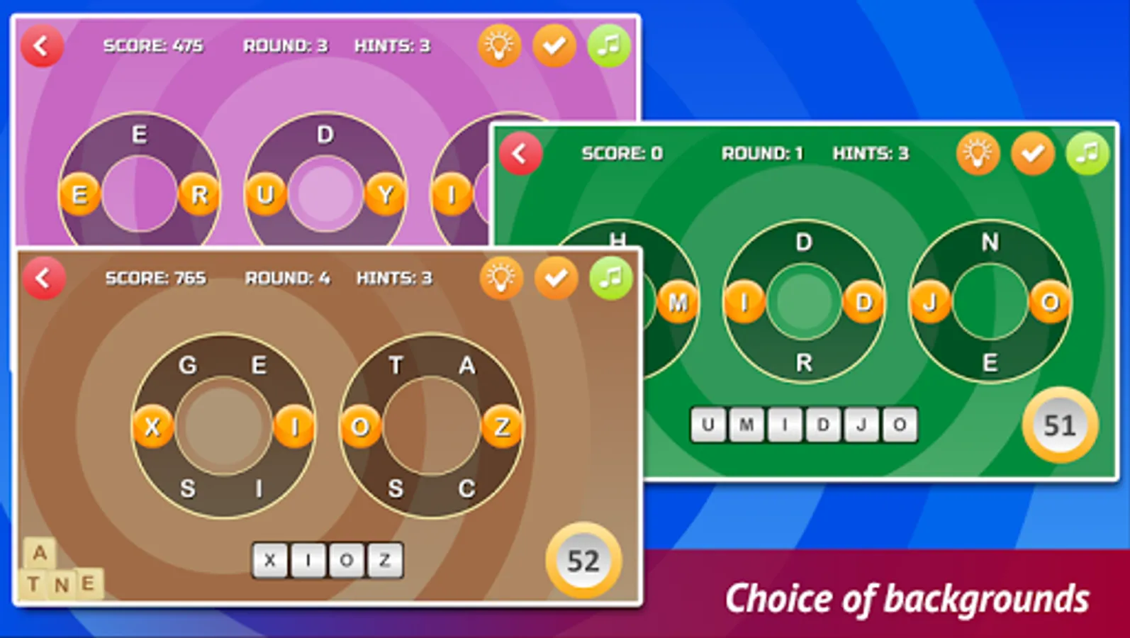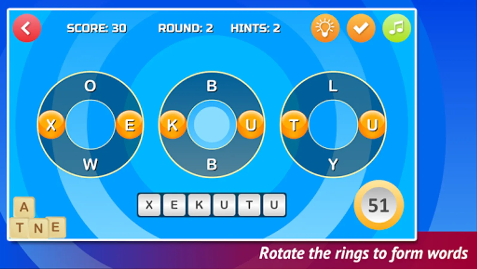 Can you imagine what it's like to turn a game on its head? Here's your chance to do it over and over again. God of the Rings is a cool word game yet that will have you in a spin … quite literally! Unscramble the letters on the rings to form words. Just rotate the alphabet rings so that the letters falling on the center slots form a valid word. Do it faster, better, and as it gets tougher - become the God of the Rings!