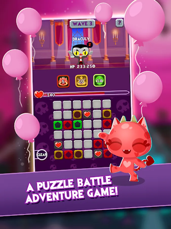 Are you ready to join this turn-based puzzle adventure? On this puzzle battle game you help monsters that wants to throw a party with their friends, but to do so, you have to invade the Draculy’s castle and defeat him. Do you have what it takes to take him down?
