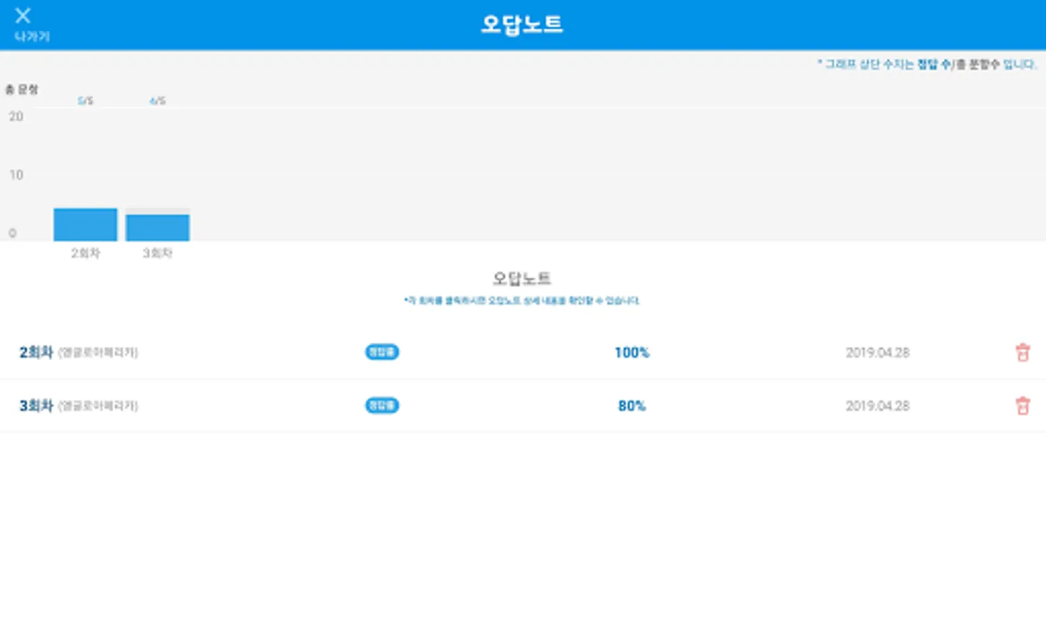 - 위치 TEST 후 회차별로 자신의 정답률과 정답&오답 문항을 확인할 수 있으며, 틀린 문제는 반복 TEST를 통해 재학습 하실 수 있습니다.