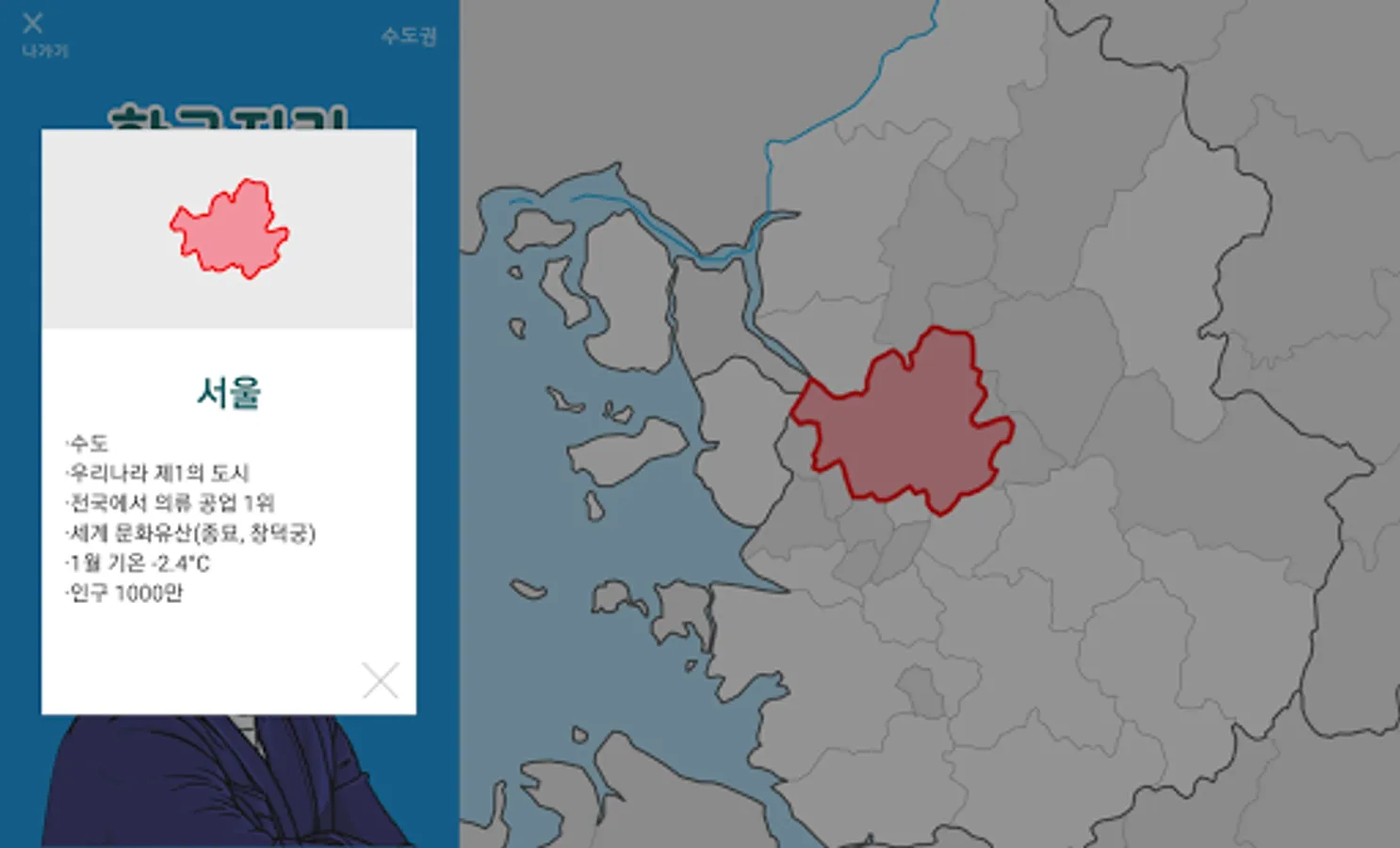 - 권역별로 자신이 취약한 부분을 선택하여 학습할 수 있으며, 한국지리 백지도에서 특정 위치-지역을 클릭하면 해당 위치와 지역의 주요 특징을 확인할 수 있습니다.