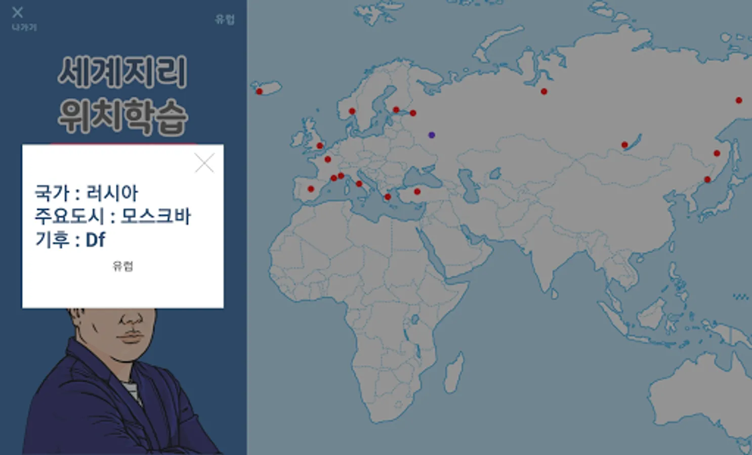 - 대륙별로 자신이 취약한 부분을 선택하여 학습할 수 있으며, 세계지리 백지도에서 특정 위치-지역을 클릭하면 해당 위치와 지역의 주요 특징을 확인할 수 있습니다.