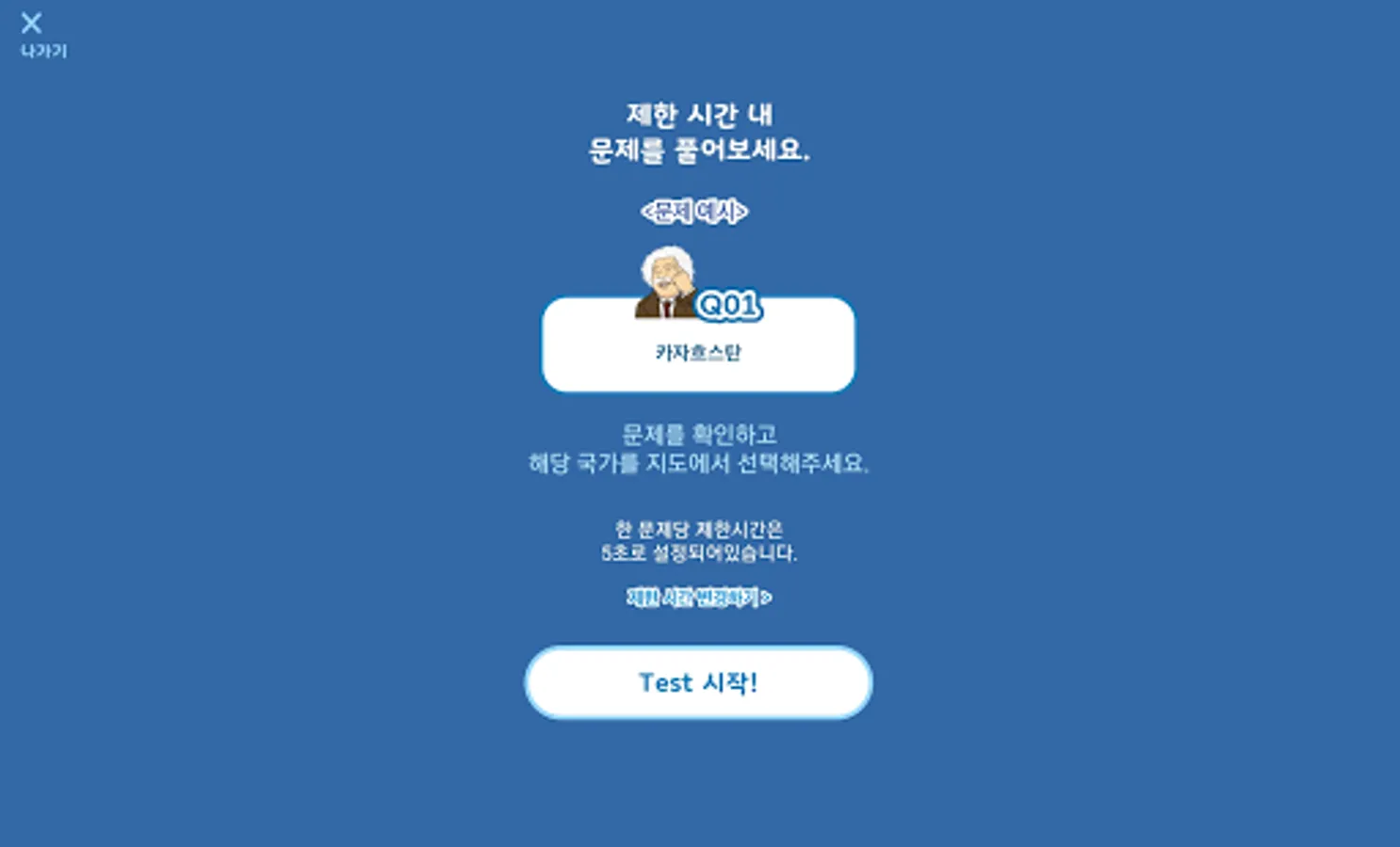 - 제한 시간 내에 질문에 해당하는 지역을 지도상에서 터치하여 퀴즈를 맞힐 수 있습니다.