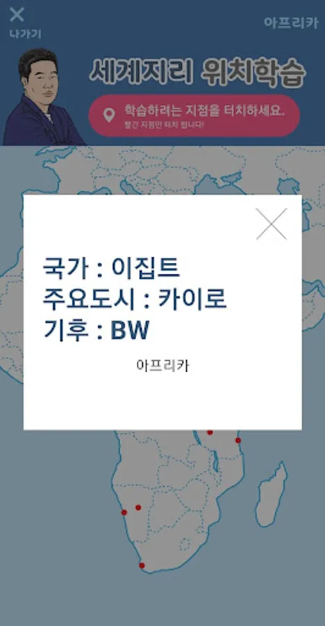 - 대륙별로 자신이 취약한 부분을 선택하여 학습할 수 있으며, 세계지리 백지도에서 특정 위치-지역을 클릭하면 해당 위치와 지역의 주요 특징을 확인할 수 있습니다.