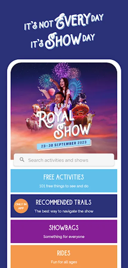 The Perth Royal Show is back, and better than ever. All the family entertainment, rides, shows and food you love, plus new experiences never seen before at the Show. Download the Perth Royal Show app to get your tickets, and for up-to-the-minute information about everything happening at this year's show.