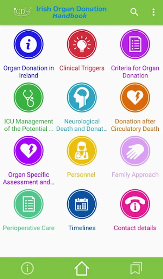 The Irish Organ Donation Handbook application is divided into 12 icons: